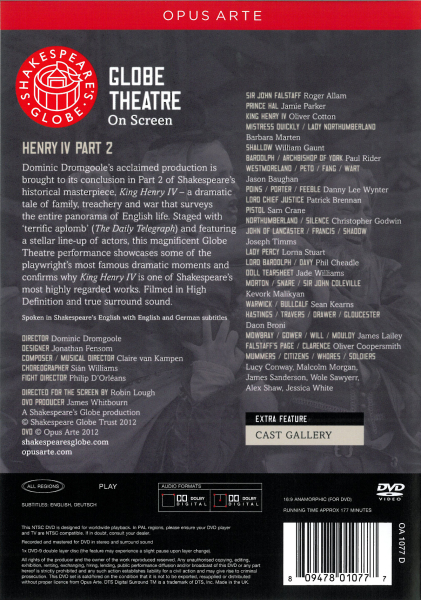 Dominic Dromgoole's acclaimed Olivier award-winning production is brought to it's conclusion in Part 2 of Shakespeare's historical masterpiece, Henry IV - a thrilling tale of family, treachery and war that surveys the entire panorama of English life. Staged with 'terrific aplomb' (Daily Telegraph) and featuring a stellar line-up, this magnificent Globe Theatre performance showcases some of the Bard's deftest dramatic skill, and confirms why Henry IV is regarded as one of Shakespeare's finest works. "It is the first time these wonderful plays have been staged at the reconstructed globe and it may be one of this theatre's finest achievements." (The Daily Telegraph), Runningtime: 00:00:00, Labelcode BOPU1077DVD