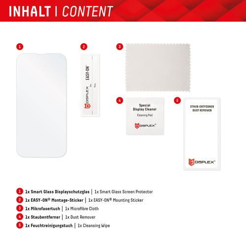 Smart Glass (9H), unzerbrechlich, ultra-dünn, unsichtbar, mit EASY-ON® Stickern Das DISPLEX Smart Glass ist die Kombination aus konventionellem Panzerglas und extrem dünner, flexibler, unzerbrechlicher Premium-Schutzfolie. Mit einer Oberflächenhärte von 9H bietet es einen sehr guten Schutz gegen Kratzer und andere Schäden. Zugleich ist es mit 0,3mm ultra-dünn, widerstandsfähig, flexibel bzw. biegsam und dadurch nahezu unkaputtbar. Das DISPLEX Smart Glass wird mit modernster Lasertechnologie in unserer Produktion In Straubing gefertigt und exakt an die Kontur des Smartphone Displays angepasst - Made in Germany. Die uneingeschränkte Funktionalität, Farbbrillanz und Hüllenkompatibilität sind selbstverständlich garantiert. HüllenfreundlichUnser DISPLEX Smart Glass wird bis auf 5/100 mm genau auf die Smartphone Konturen gefertigt und passt somit perfekt auf Ihr Smartphone. Außerdem ist die Schutzfolie ultradünn. Somit lassen sich alle handelsüblichen Schutzhüllen & Cases mit der Panzerglasfolie