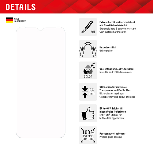 Vidrio inteligente (9H), irrompible, ultrafino, invisible, con pegatinas EASY-ON® El DISPLEX Smart Glass es la combinación de vidrio antibalas convencional y una película protectora de primera calidad extremadamente fina, flexible e irrompible. Con una dureza superficial de 9H, ofrece una muy buena protección contra arañazos y otros daños. Al mismo tiempo, con sus 0,3 mm, es ultrafino, duradero, flexible y, por lo tanto, casi indestructible. El DISPLEX Smart Glass se fabrica con la última tecnología láser en nuestra planta de producción de Straubing y se adapta con precisión a la forma de la pantalla del teléfono inteligente. Fabricado en Alemania. La funcionalidad ilimitada, el brillo del color y la compatibilidad de fundas son, por supuesto, excelentes. Nuestro DISPLEX Smart Glass se fabrica con precisión según los contornos del smartphone, hasta 5/100 mm y, por lo tanto, se adapta perfectamente a tu smartphone. Además, la película protectora es ultrafina. Esto significa que todos los estuches y estuches de protección estándar se pueden utilizar con la película de vidrio antibalas.